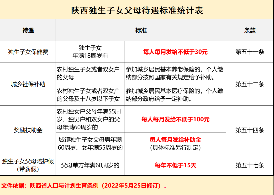2.除此以外,陕西省的农村独生子女户和双女户,凭《独生子女父母光荣证》或者双女户夫妻的节育证明,还可在经济项目、技术等方面,获得政府资助和政策扶持。总体来说,在全国范围内,陕西省的标准,属于中等偏上水平,为陕西点赞!