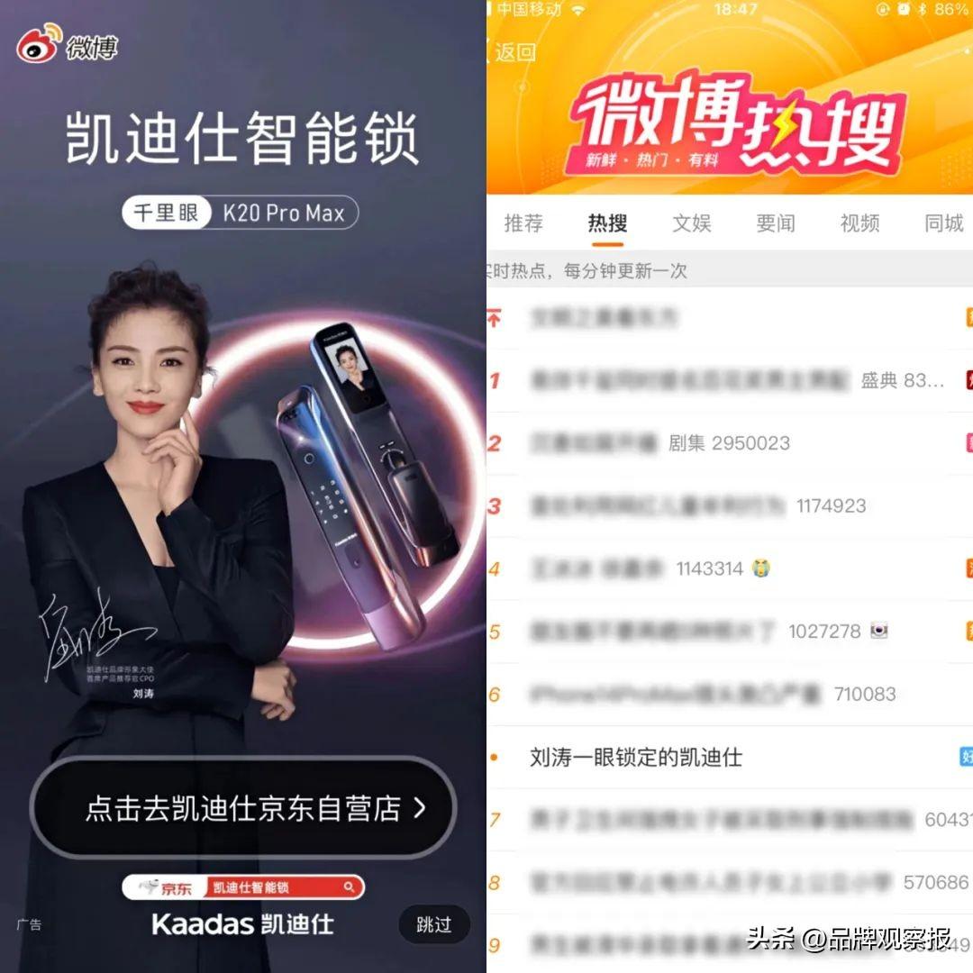 微博端,凯迪仕的话题热度同样不断攀升。凯迪仕智能锁“千里眼” K20 Pro Max登陆微博开屏,占据高位热搜第6位。在品牌形象大使&首席产品推荐官刘涛的打call助力下,话题#刘涛一眼锁定的凯迪仕#登上热搜,阅读量轻松突破1.2亿,引发了5.1W人在线热议。