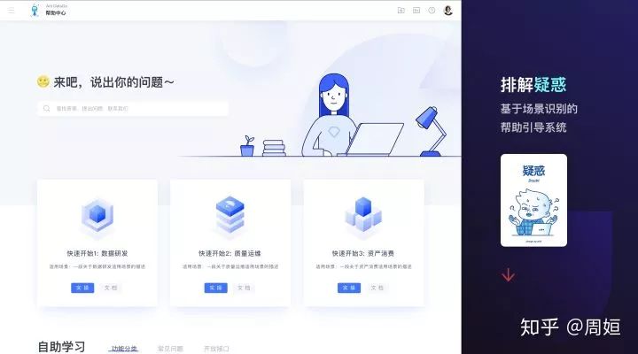 另外,我们对全局帮助面板进行升级,它的形式不再是一成不变,而是因地制宜,根据用户当前访问的功能模块,给出常见问题指引和快速开始教程。