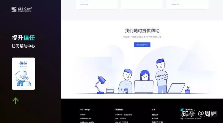 我们为产品幕后的工程师、设计师和产品经理分别构建了一个虚拟形象,以团队协作的姿态呈现在此处,结合文案 「我们随时提供帮助」 引导用户访问帮助中心,希望借此提升产品值得信赖的形象。