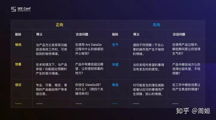 为了更精准地向用户传达这些指标的含义,我们查询了这十个情感名词在心理学中的解释,并结合企业级产品特征转化成用户能理解的释义。另外,我们还基于这次调研的目标产品——Ant DataGo 数据研发平台,拟定了关于产品的十个情感化访谈问题。