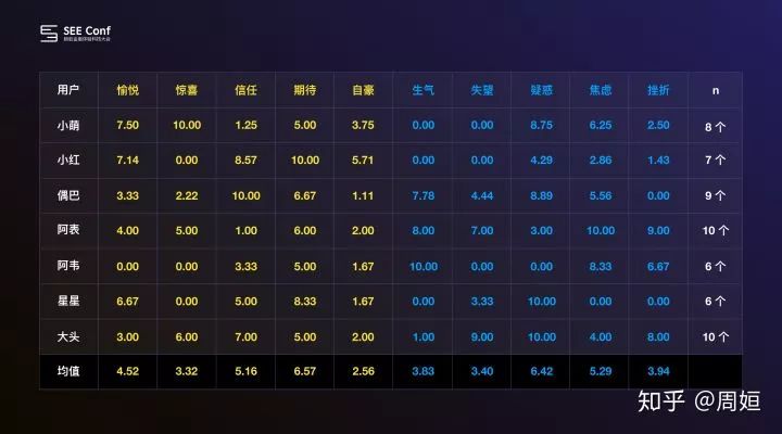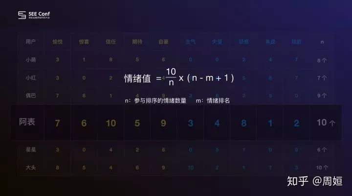 将每位用户选择的情绪卡片的序列号,以及参与排序的情绪数量罗列出来,采用一个简单的公式,统计这些情绪指标的得分,以便从宏观层面对所有情绪诉求的强弱进行观察:
