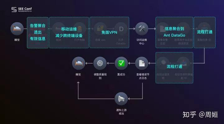 聚合告警事件,解决告警井喷的问题;借助钉钉平台,开发移动运维小程序,利用手机解决大部分运维任务;针对跨平台问题,在 Ant DataGo 上整合底层引擎能力,将信息聚合到 Ant DataGo;流程断点问题是设计师最擅长的技能,不在话下。最终我们产出了一条新的任务流程,能快速在手机端解决 60%~70% 的运维任务。