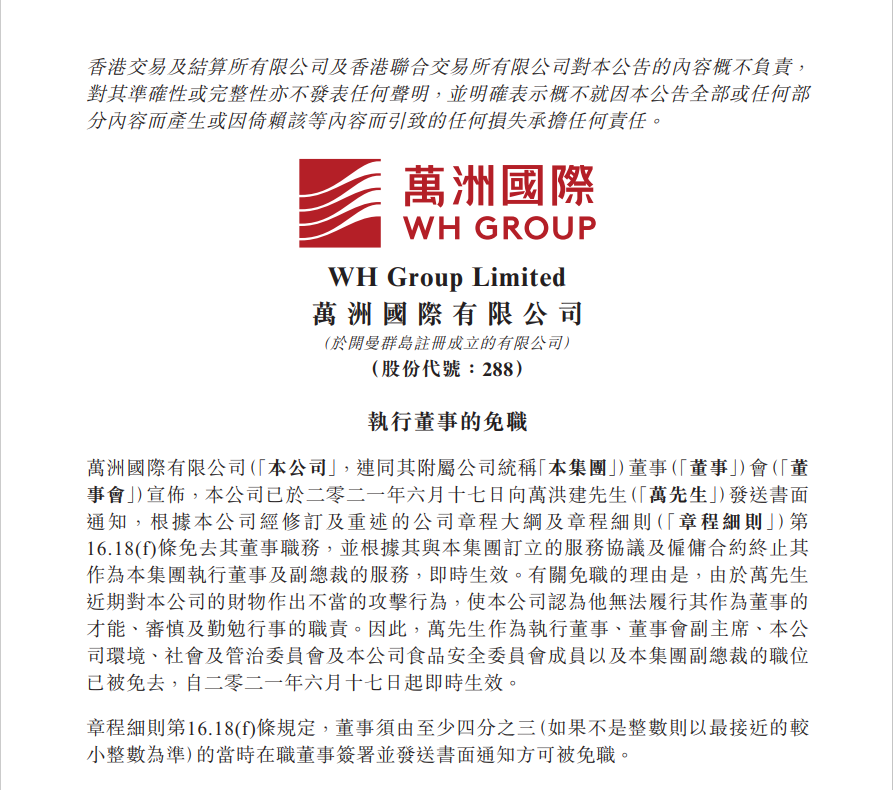 2021年6月17日,万洲国际的一封人事罢免的公告让这个家庭矛盾赤裸裸地暴露在公众面前。