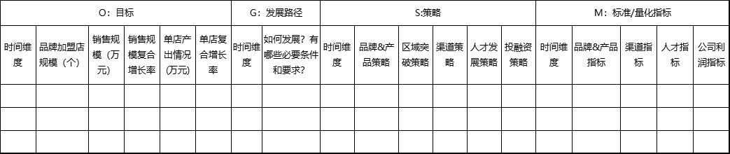 我们可以采用O-G-S-M的工具来制定企业的年度计划,O(Objective)指的是企业三五年内想要达到的目标,G(Goal)指的是阶段性的目标。S(Strategy)指的是针对阶段性目标的执行策略。M(Measurement)指的是评估策略的量化标准。所以总经理可以先采用这样的表格制定框架(以连锁企业为例),再由下属各部门去做细化,并落实。