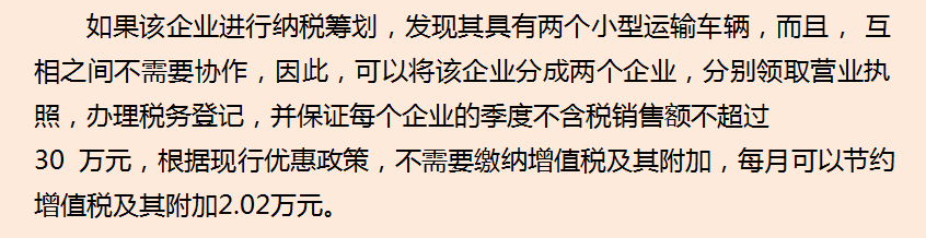 纳税筹划案例:某小型物流企业每季度不含税销售额为60万元左右,属于增值税小规模纳税人。该小型物流企业每季度需要缴纳增值税、城市维护建设税、教育费附加和地方教育费附加:60×3%×(1+12%)=2.02(万元)。请对该企业给出纳税筹划方案。