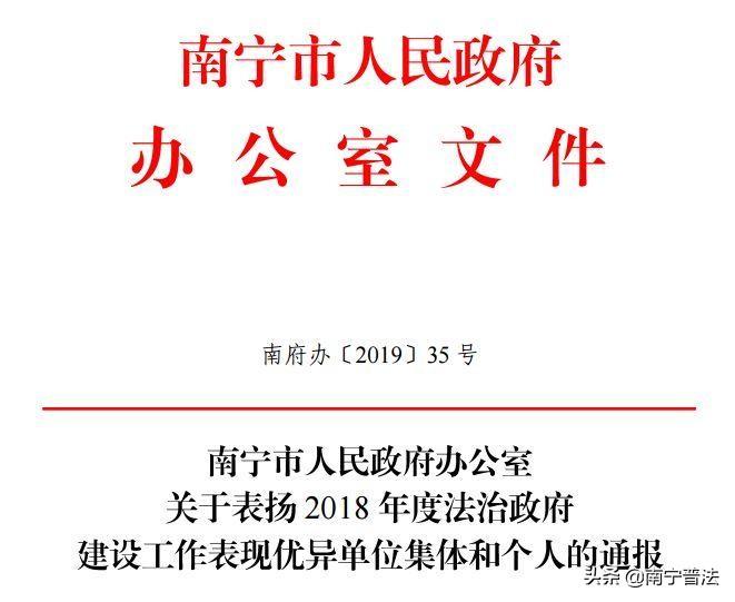 2019年5月31日,南宁市人民政府办公室印发了《关于表扬2018年度法治政府建设工作表现优异单位集体和个人的通报》,对我市2018年度法治政府建设工作表现优异的江南区人民政府等15个单位、兴宁区法制办等20个集体、韦伟文等55名个人和在推进法治政府建设工作表现优异的市委办公厅等15个单位进行通报表扬(具体名单附后)。