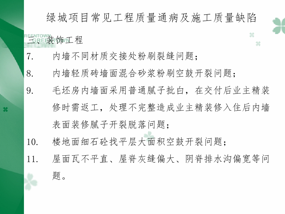包含六大工程:地基与基础、主体结构、装饰、防水、门窗、室外硬质景观工程;从多方面分析产生工程质量问题的原因,ppt格式方便手机查看,提前预防施工问题,建议收藏!