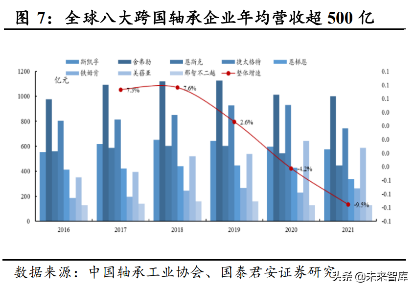 全球八大跨国轴承企业体量大,近年来增速放缓。全球八大跨国轴承企 业体量巨大,多数企业营收在 300 亿以上,近年来合计营收增速放缓甚 至转负,源于疫情对于跨国公司生产、贸易造成的负面影响。