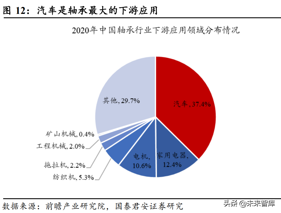 汽车发动机轴承市场占比最大。2020 年中国轴承市场约为 2000 亿元, 其中下游汽车行业占据 37.4%,约为 748 亿元。汽车轴承主要分为发动 机、传动部分以及行使系轴承。根据汽车发动机、传动部分以及行使系 的成本可以估算其轴承成本比例为 16:10:3。由此可得汽车发动机、传动部分、行使系轴承市场分别为 413 亿元、257 亿元、78 亿元。