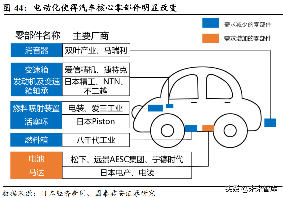 电动化使得汽车核心零部件明显改变。汽车的电动化导致发动机需求减 少,用于发动机的轴承市场也将萎缩。但汽车所需要的轴承数量总体不 会有太多变化,大部分变化基于轴承类型的改变——由于多数纯电动车 省去了变速箱配置,且增加了电机,故原有用于变速箱的轴承将会被替 换为满足电机需要的产品。对于电动汽车上增加的新的轴承产品需求, 汽车轴承供应商必须进行有针对性的创新研发。