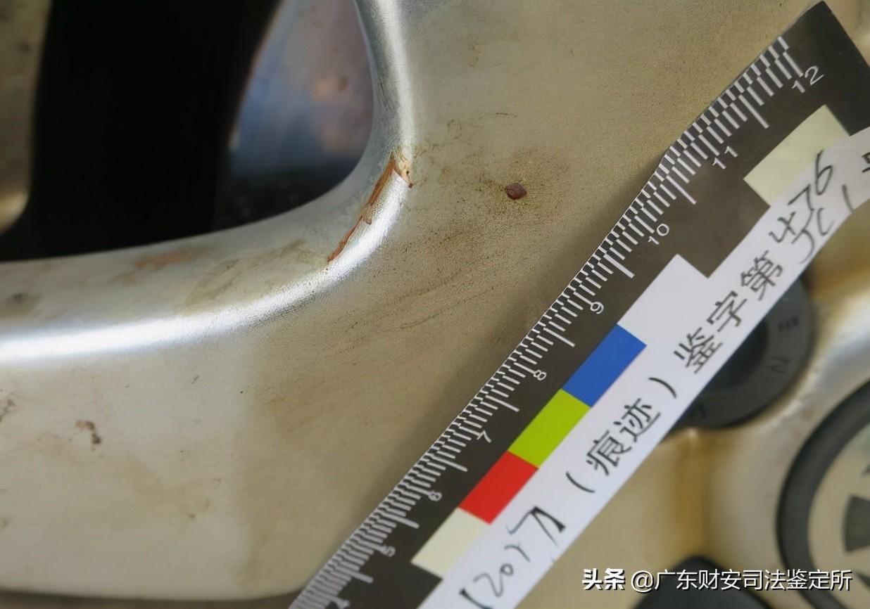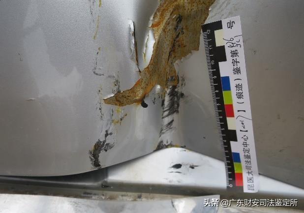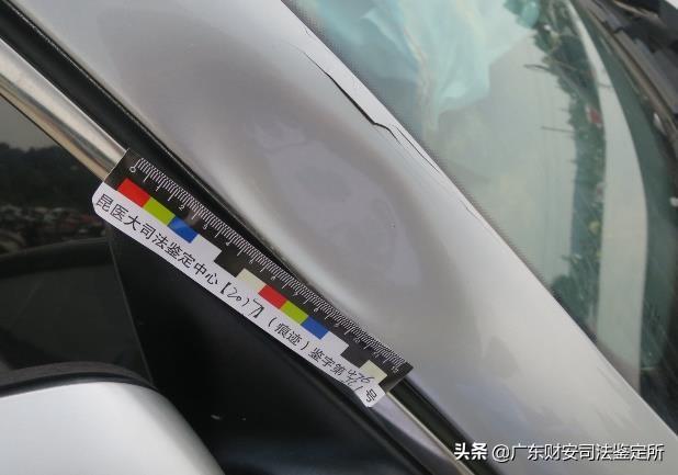 5.云A·XXXX号“宝来”牌小型轿车,车前挡风玻璃右侧立柱凹陷变形,变形周围表漆龟裂,右前轮外侧胎壁及轮毂见条形刮擦痕,痕中见人体组织及血样物质附着,根据痕迹所在部位、高度、形态特征及形成机理等方面,分析符合与相应高度的软质物体(如人体)相碰撞、擦压形成。(图八、图九、图十)
