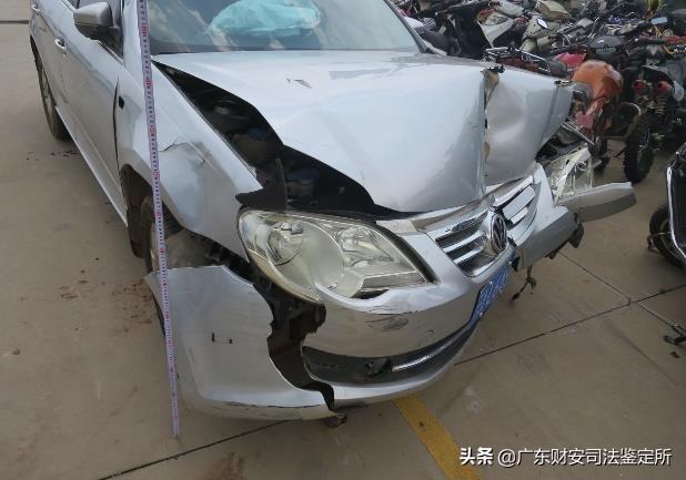 6.云A·XXXX号“宝来”牌小型轿车,车前端左侧整体向后移位凹陷变形及撞擦痕,痕中表漆剥脱并见黑色及黄色漆样物质附着,车体破损,根据痕迹所在部位、高度、形态特征、附着物反映及形成机理等方面,分析符合与相应高度及特征的硬质物体(如现场限高杆)相撞擦形成。(图十一)