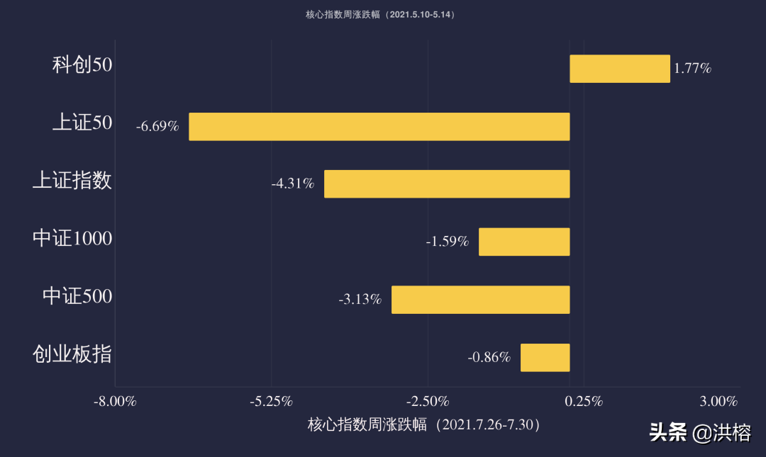 7月最后一周,沪指涨幅-4.31%,成交额30151亿元,深成指涨幅-3.70%,成交额37973亿元,创业板指涨幅-0.86%,成交额16342亿元,科创50涨幅+1.77%,成交额4074亿元。