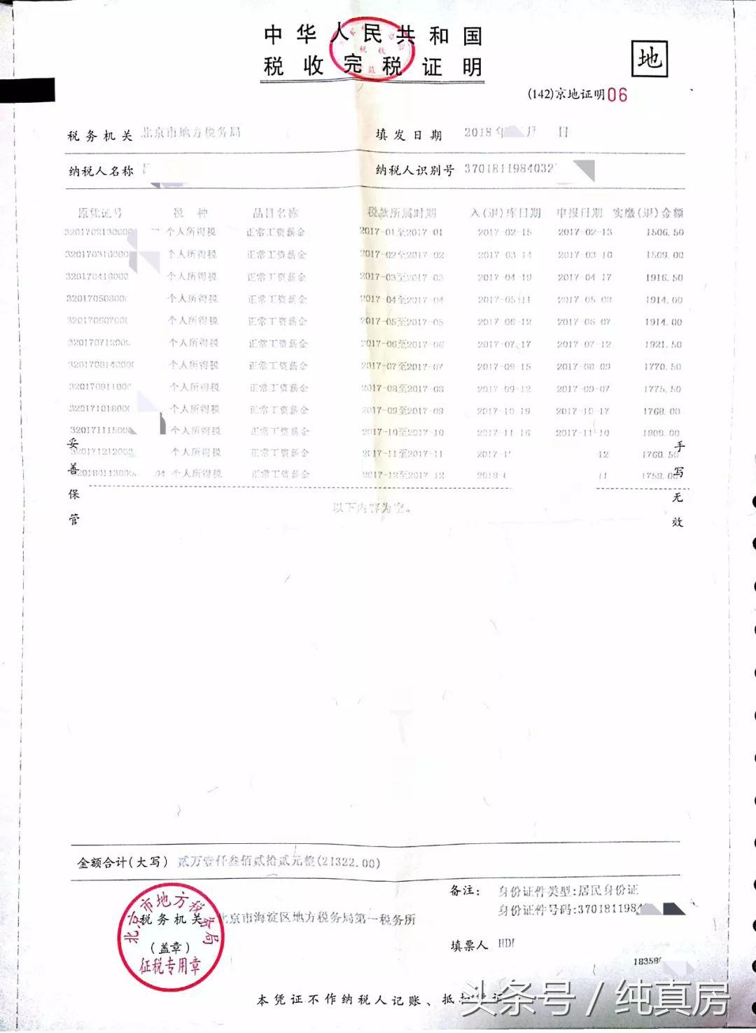 证明内容包括纳税人姓名、纳税人识别号、原凭证号、税种、纳税项目、税款所属期、实缴税款等条目。完税证明左下方是北京市地税局专用章,右下方是居民身份证号码、填票人信息以及完税凭证号。
