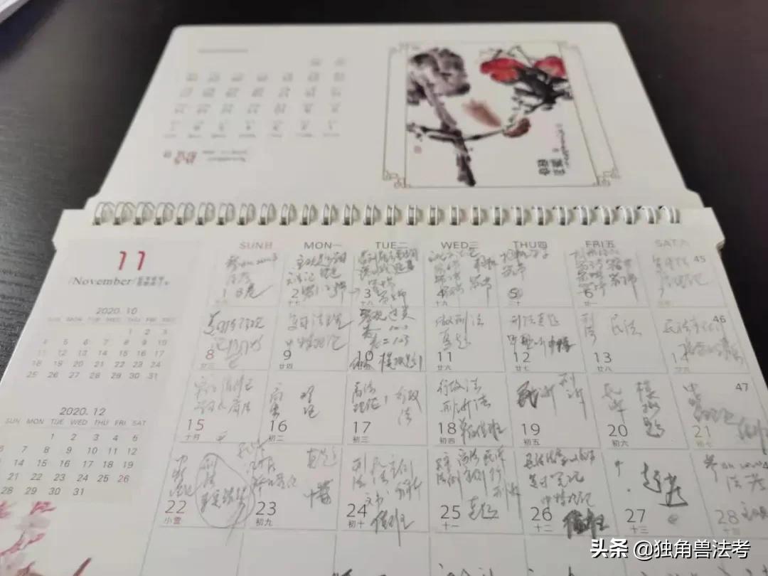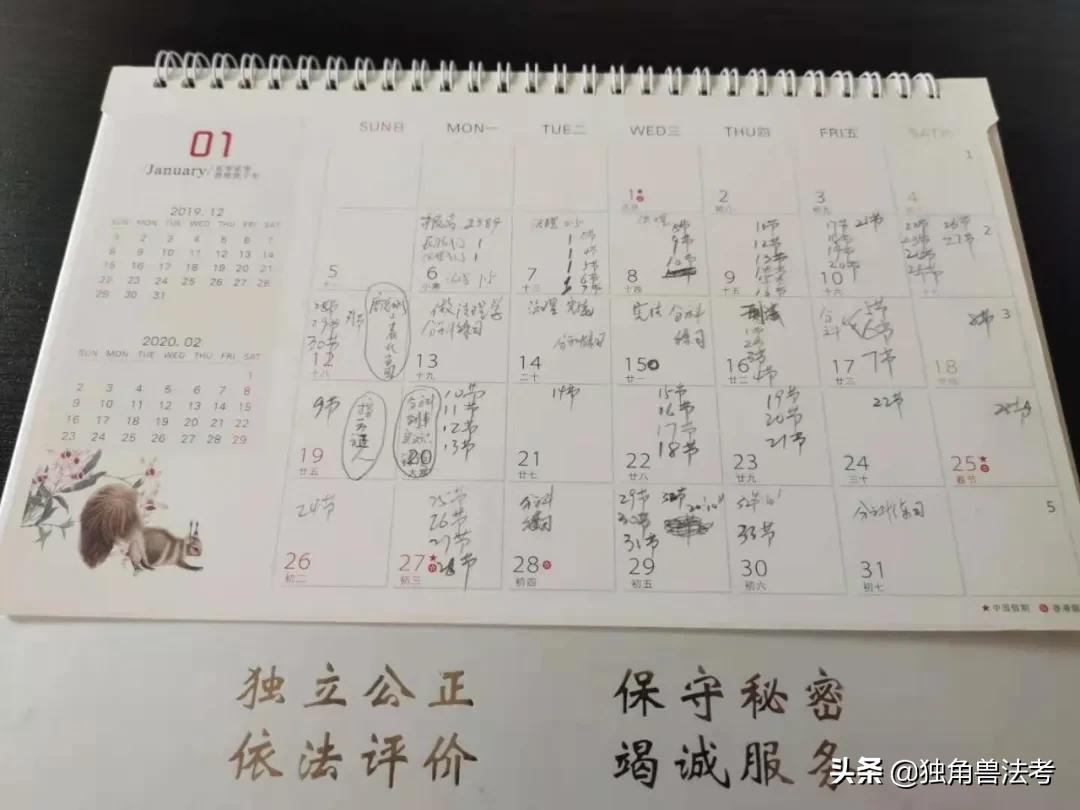 教务老师及时给我制定了学习计划,并就如何听课做了电话沟通和指导。接下来我就按部就班地开始学习了,由于工作性质的原因,我们上了案子就没有固定的时间了,有时候晚上回家都保障不了,但是无论多忙,每天总要挤出一点时间听课或做题,独角兽的手机APP很方便,可以随时随地的学。我准备了一个台历,用它简要记录我每天的学习进度。