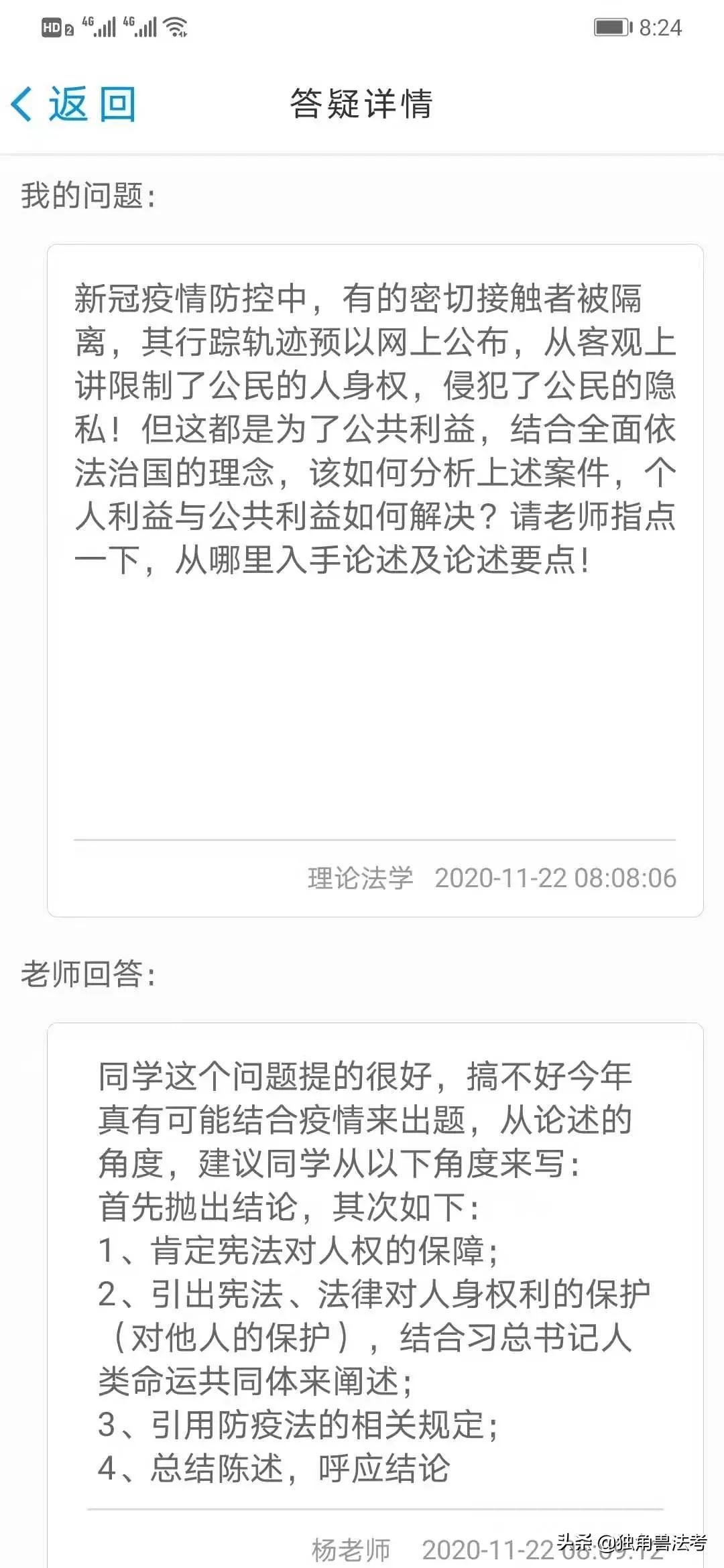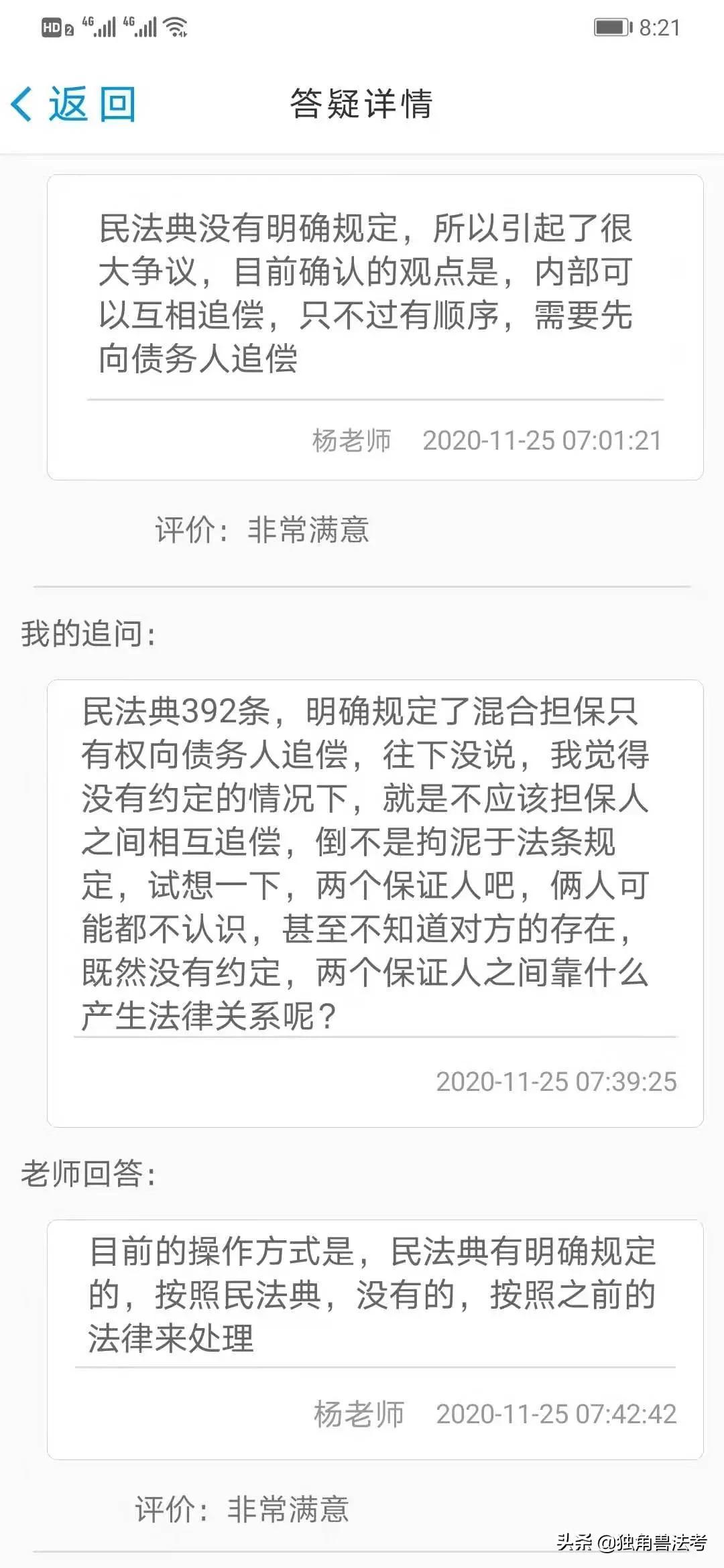 另外,我在学习过程中充分利用了独角兽的答疑反馈模块,把身边或通过生活受启发想起来的事,自己改编成案例,向老师请教,然后根据老师的回答再翻教材,找法条进行细细品味,有的地方觉得老师回答得不是很到位,继续向老师追问,这个方法很有利于我对法条的理解和记忆。
