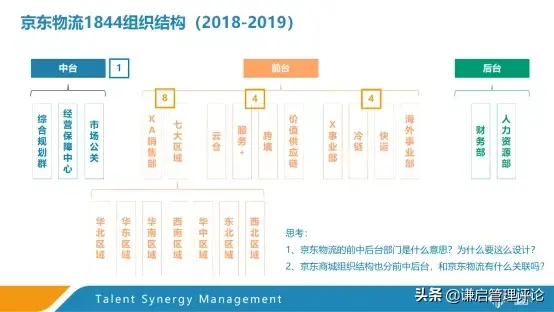 京东物流实现仓配一体化,就注定会带来的人员管理问题。菜鸟物流员工不过5000,而京东物流员工却在10万以上。为了更好的管理集团,2018年京东物流建立了自己的组织体系,1844组织结构。