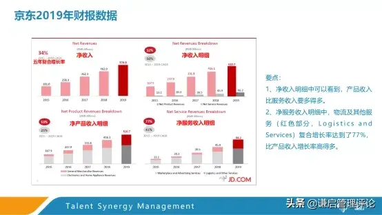 这里展示了京东2019年财报里关于其收入情况的内容,这张图左上的图表示的是净收入,右上的图表是净收入明细,分为产品收入和服务收入,左下的图是净产品收入明细,而第四个是净服务收入的明细。我们在这里要看的主要是净收入、净收入明细和净服务收入明细。第一张图展现了京东净收入五年来的总体情况,左上角的34%旁进行了标注,这个CAGR的百分比指的是年复合增长率,另外三张图也是指这个意思。