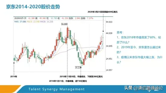 我们来看看京东股价走势图,京东上市以来,2018年1月31日市值达到了顶峰,为730亿美元左右,而2018年年底,京东的市值则跌到了280亿美元左右。在2018年一年之间,京东可以说是经历了大起大落,2018年,京东经历了什么呢?