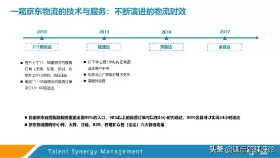 我们通过京东物流的时效性来看一看,京东物流现在的服务能做到怎么样。2010年,京东提出了211限时达,也就是当天上午11点前提交的现货订单,可以当日送达,而夜里11点前提交的现货订单则是次15点前送达。大家有在京东自营店铺买过东西的,应该都感受到过京东配送的速度。2013年,京东提出了极速达,下单之后的三个小时内把商品送到客户手中。此外,2016年和2017年,京东分别提出了京准达和京尊达,京准达是在限制的两个时间范围内,精准送达。京尊达则是配送人员穿着白手套和西装,开着新能源汽车将货物送达目的地。