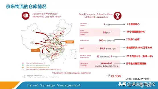 京东物流能够达到这样的配送速度,得益于其遍布全国的仓储建设。上图中的图片来自于京东2019年的财报,可以看到目前京东在全国有七个物流中心,也就是其一级仓库。其在28个城市建有前置配送中心,并且在全国京东一共有700多个仓库,总的仓储管理面积是1690万平方米左右。另外,京东有25个自己建设的大仓,叫亚洲一号。正是通过这些仓库的建设,才为京东实现全中国全地理范围的配送打下了基础,当然,这也是京东物流十多年来不断烧钱,一直亏损的原因。