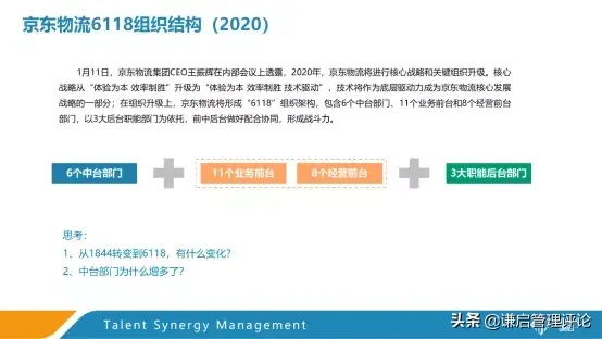 其实其前中后台的模式,尤其是中台的概念,是因为京东追求积木化组织才建设起来的,这也是其组织结构变革中一直围绕的核心,正是这种模式将壮大的京东撑了起来,是京东发展到目前规模之下在管理上实行的重要战略方向。下次谦启将继续为大家解读,京东的积木化组织究竟是什么,谢谢大家.