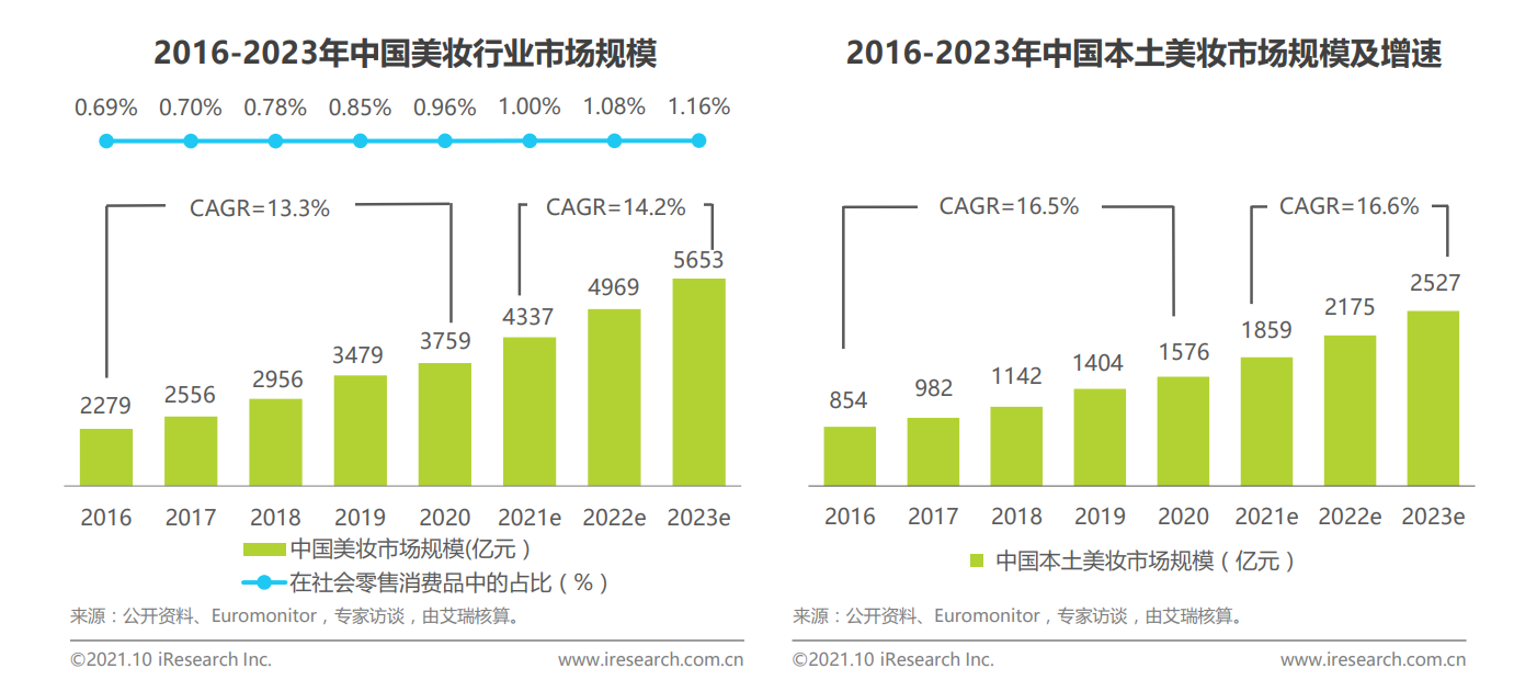 尽管本土彩妆市场占比相对较低,但未来消费者对彩妆的消费意愿及能力不断增强,彩妆行业增长空间较大,本土彩妆品牌正在崛起,将逐步打破国际品牌的垄断地位。预计2023年我国本土护肤市场规模和彩妆市场规模将分别达到1977亿元和550亿元,2021-2023年彩妆市场复合增长率达到23.8%,高于同期护肤市场的复合增长率。