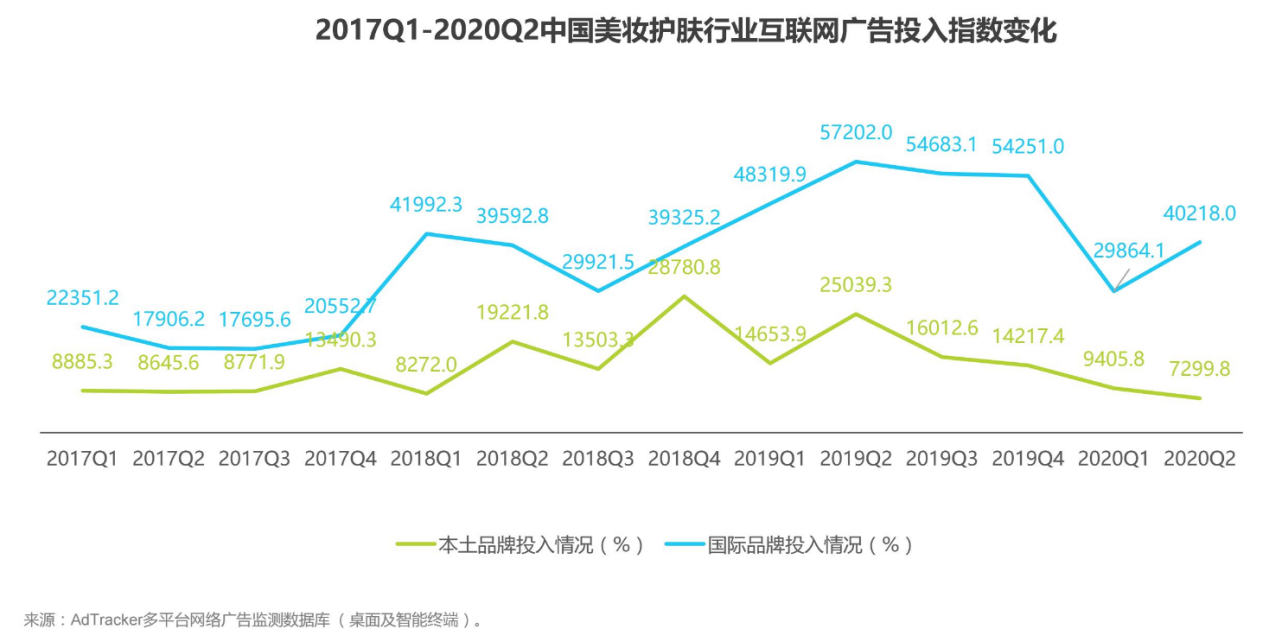 根据艾瑞AdTracker数据显示,受疫情影响,本土与国际美妆护肤品牌线上广告投入都有所缩减,表现为广告投入指数在2020Q1呈现明显下降态势;但是,到了2020Q2,国际美妆护肤品牌线上广告投入开始复苏,已出现明显的上升回暖的趋势,而本土品牌投放下降速度也有放缓的态势。