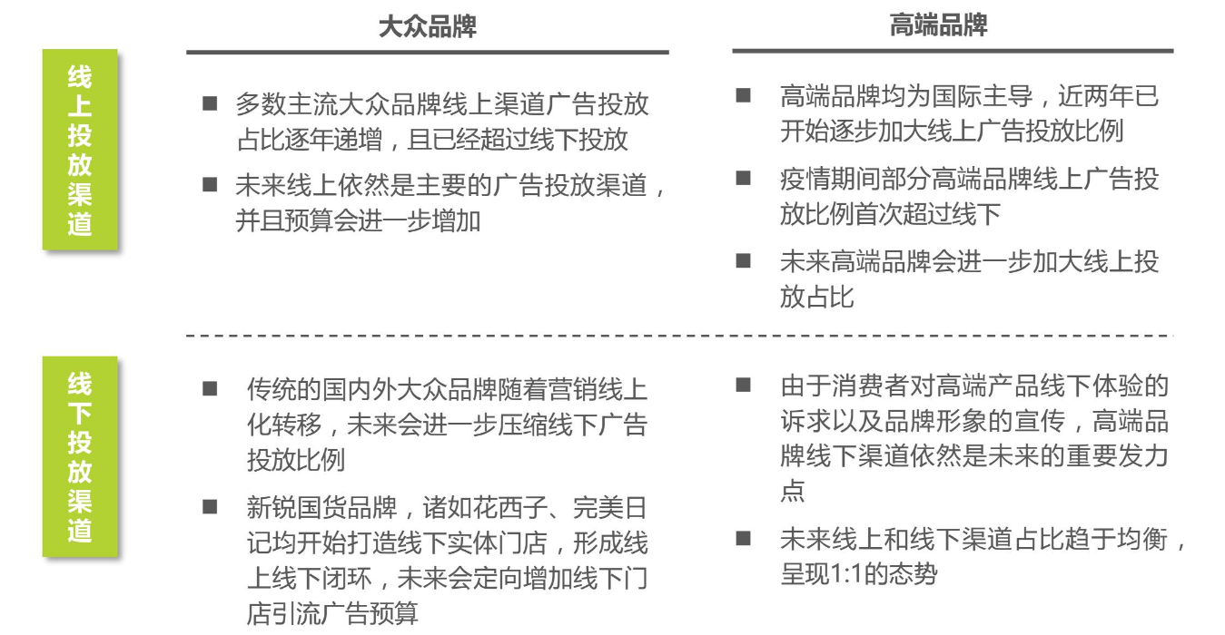 未来广告主线上投放预算会逐年增加,其中电商平台站内投放为刚需,同时广告投放会向站外倾斜,借助社交媒体圈住目标用户,增加触达频次,持续种草;此外,线下门店作为消费者体验和品牌形象宣传的载体,不可或缺,未来线下预算投放会更精准,针对门店引流需要,定向投放。