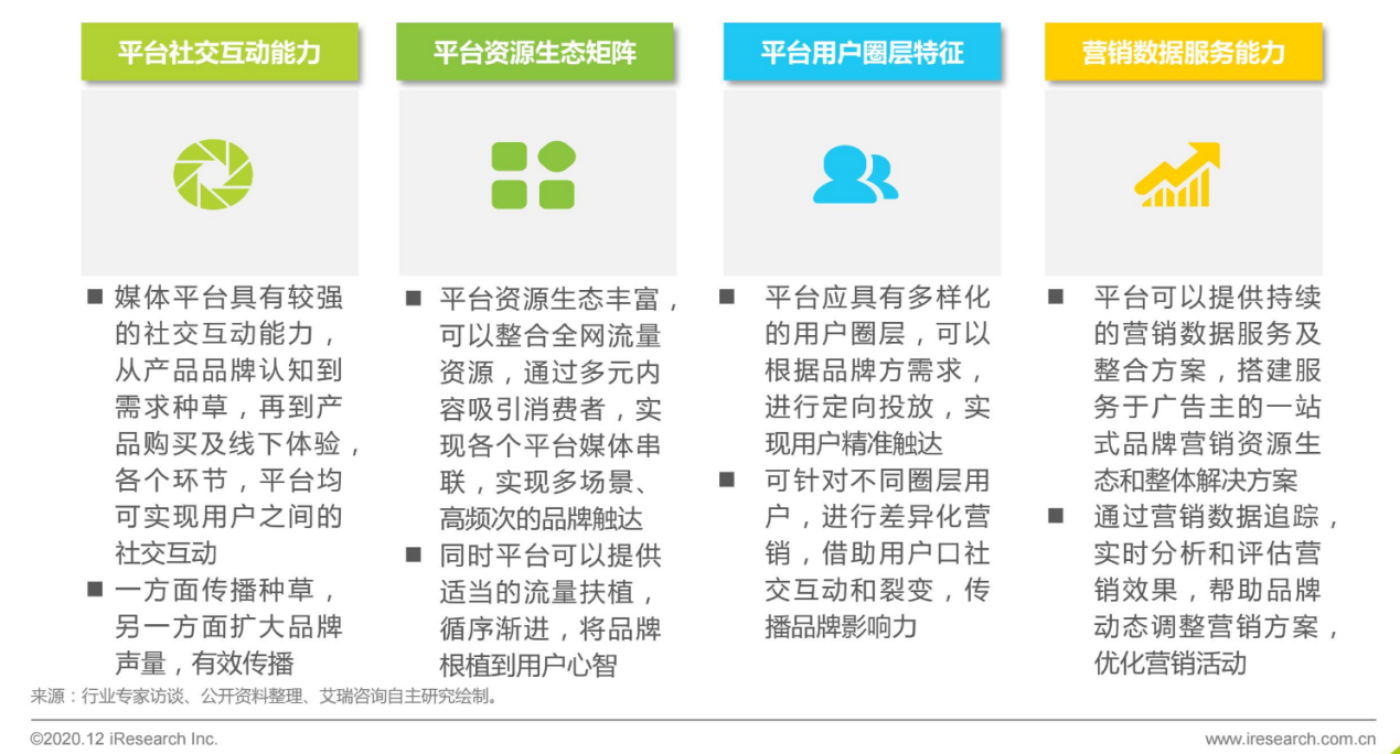 平台社交互动能力、平台资源生态矩阵、平台用户圈层特征、平台营销数据服务是广告主在选择媒介时主要关注因素;品牌根据目标用户圈层的需求特点,联合媒体和代理打造定制化、差异化的营销方案。