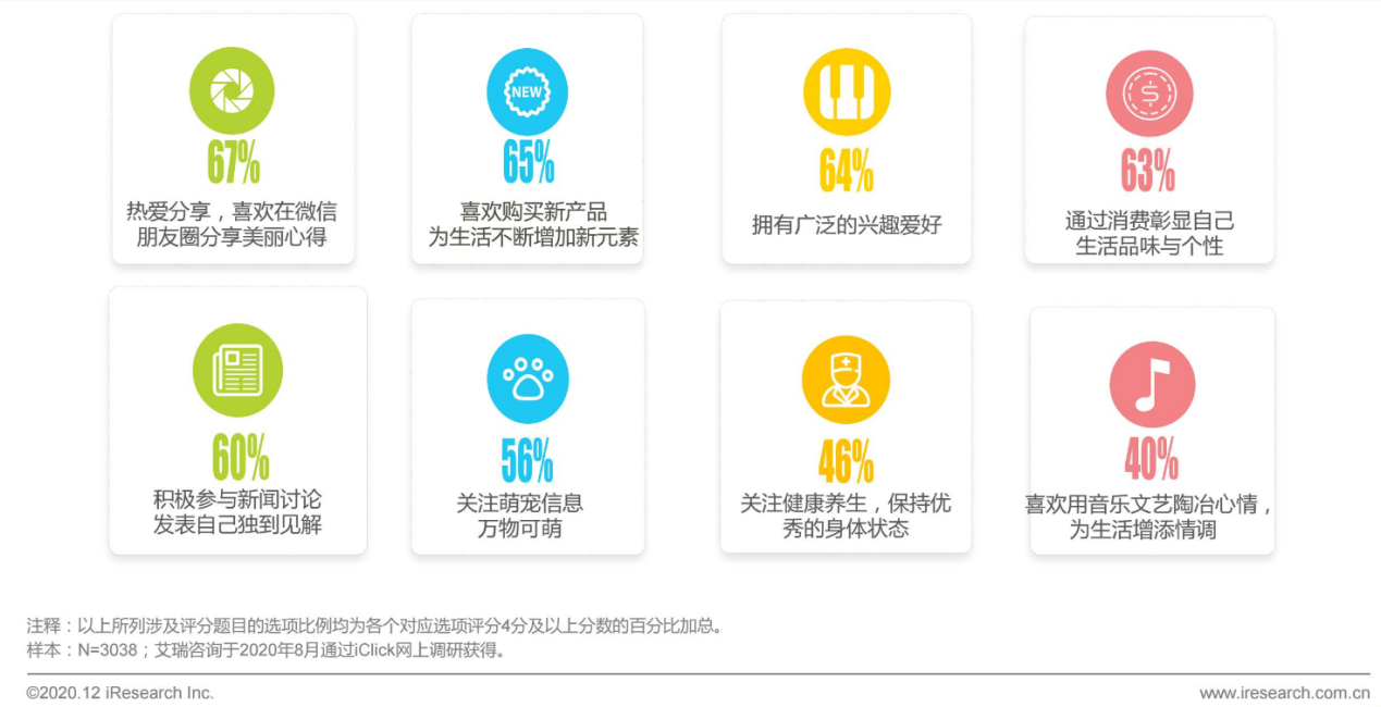 根据艾瑞咨询的调查我们可以发现,美妆护肤消费者有强烈的猎新猎奇的想法,他们喜欢喜欢体验新产品,为生活增添新元素,同时也喜欢通过消费来彰显自己的独特的生活品味与个性,此外,拥有广泛的兴趣爱好,也关注新闻时事,愿意发表自己见解,关注健康养生,做有态度的消费者,对生活充满热情,有着强烈的分享欲。