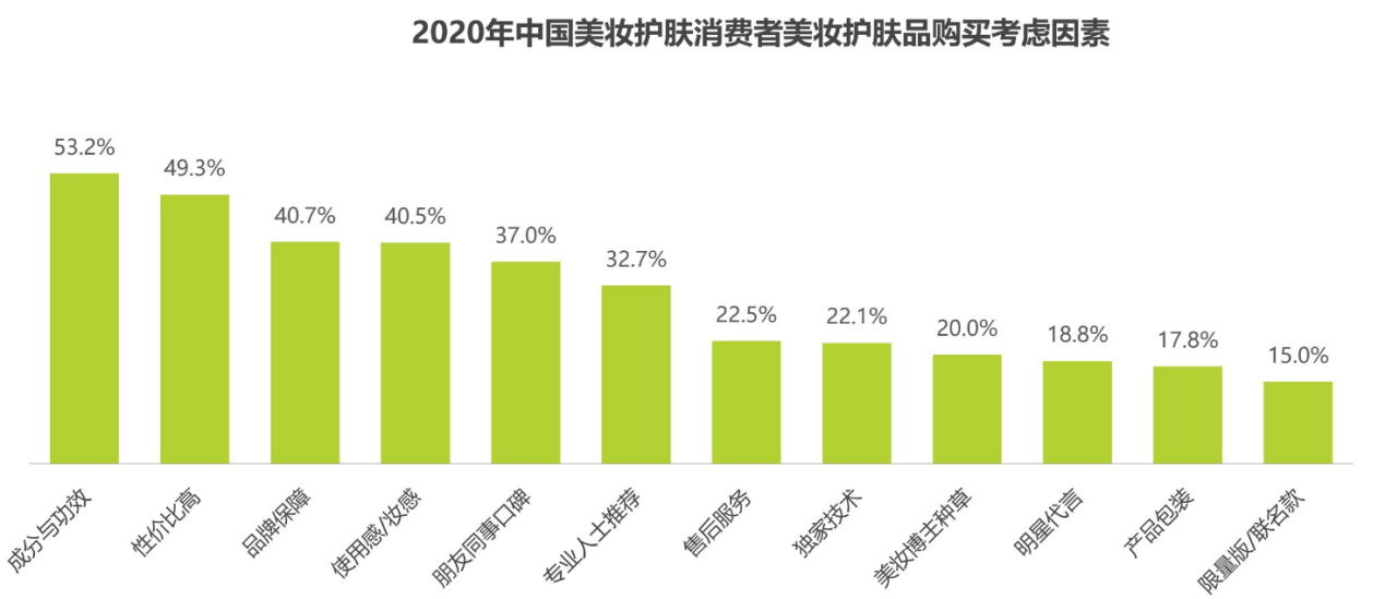 根据调查我们可以知道,产品功效与品牌保障,是美妆消费者的重要考虑因素,成分与功效、性价比和品牌保障是美妆护肤消费者最关注的三大因素,基于女性消费者更需要“安全感”,因此比男性消费者更看重品牌保障,同时,身边人和专业人士的推荐也远高于KOL种草和明星推荐。毕竟对用户来说,熟人使用过的比较有保障。