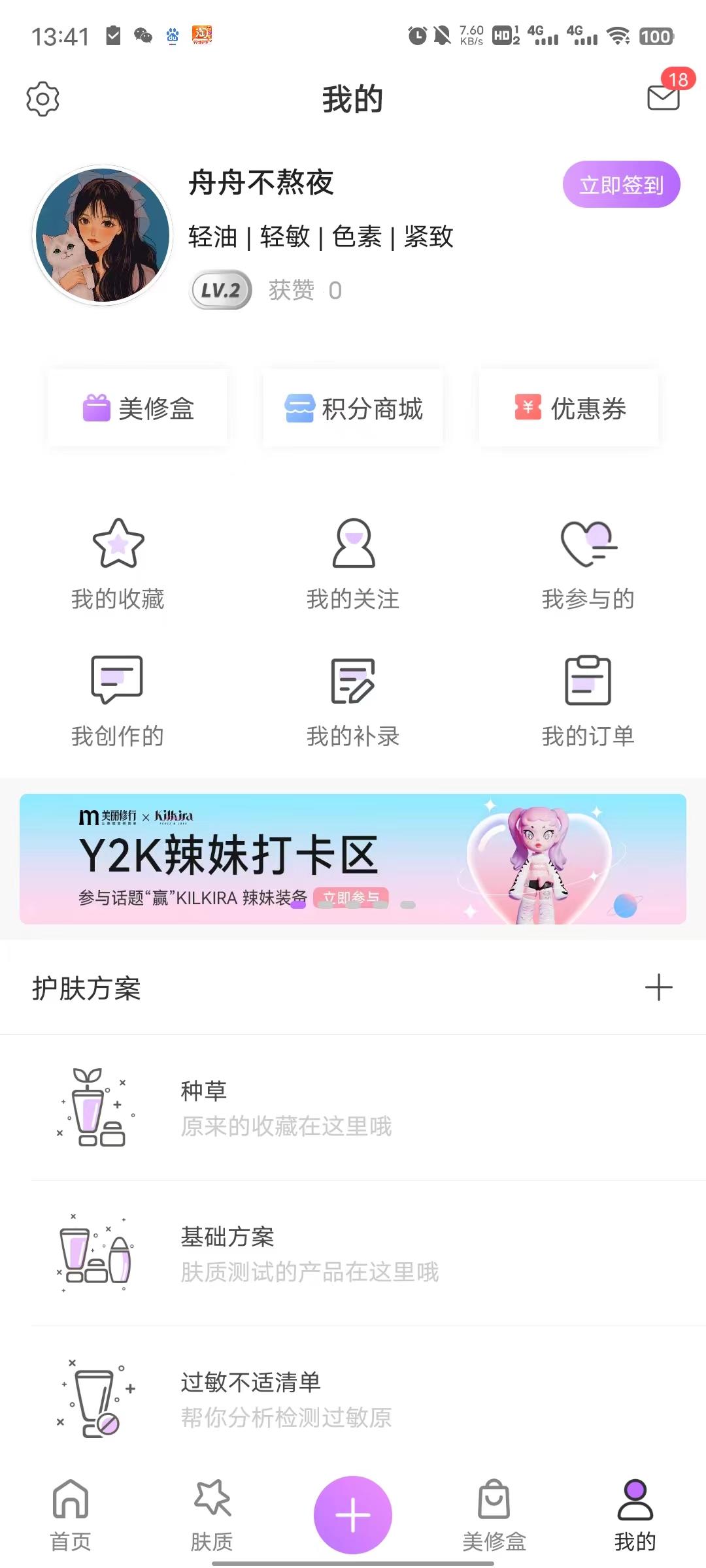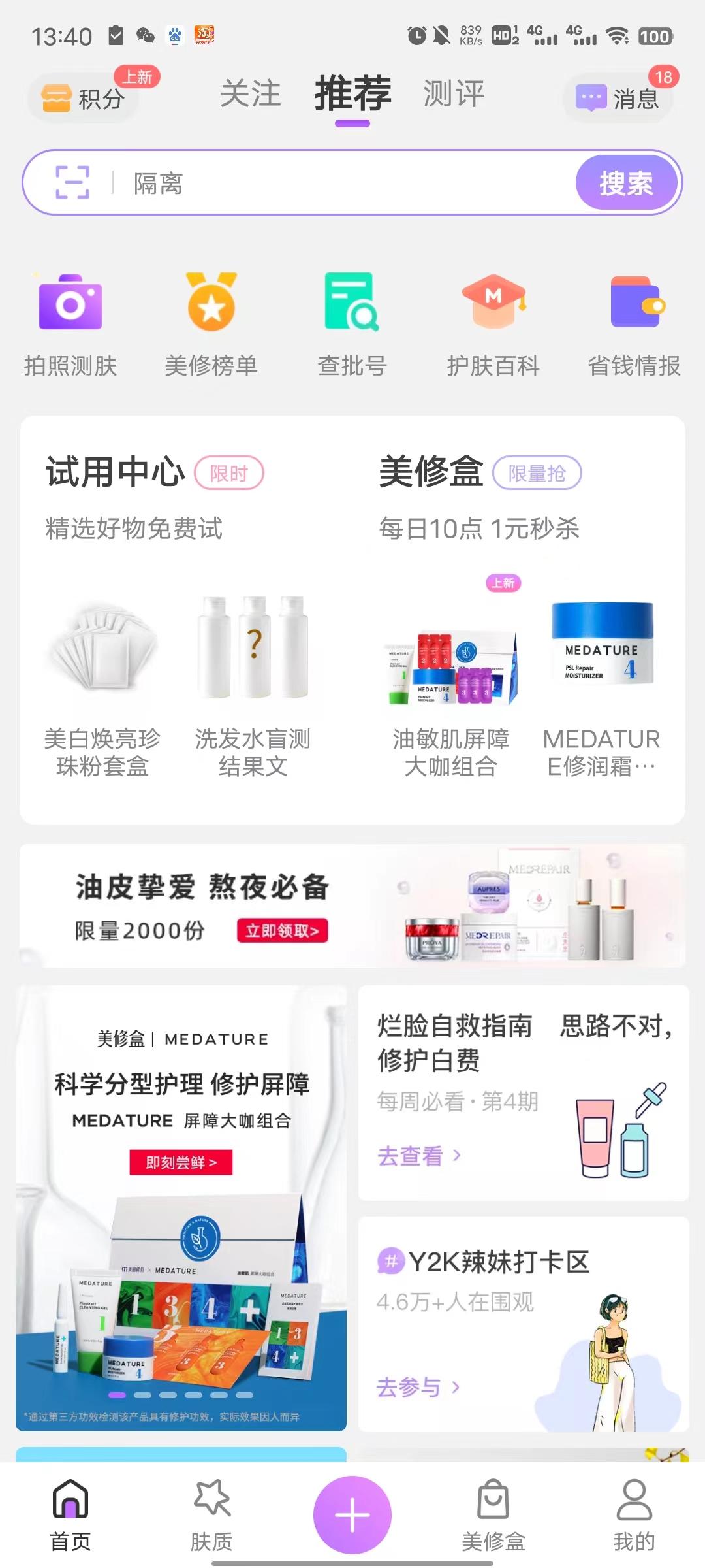 美丽修行:主打功能为成分查询,拍照测肤,同时为用户提供专属肤质报告以及商品推荐,还制定了一些活动让用户可以商品试用来决定是否购买。