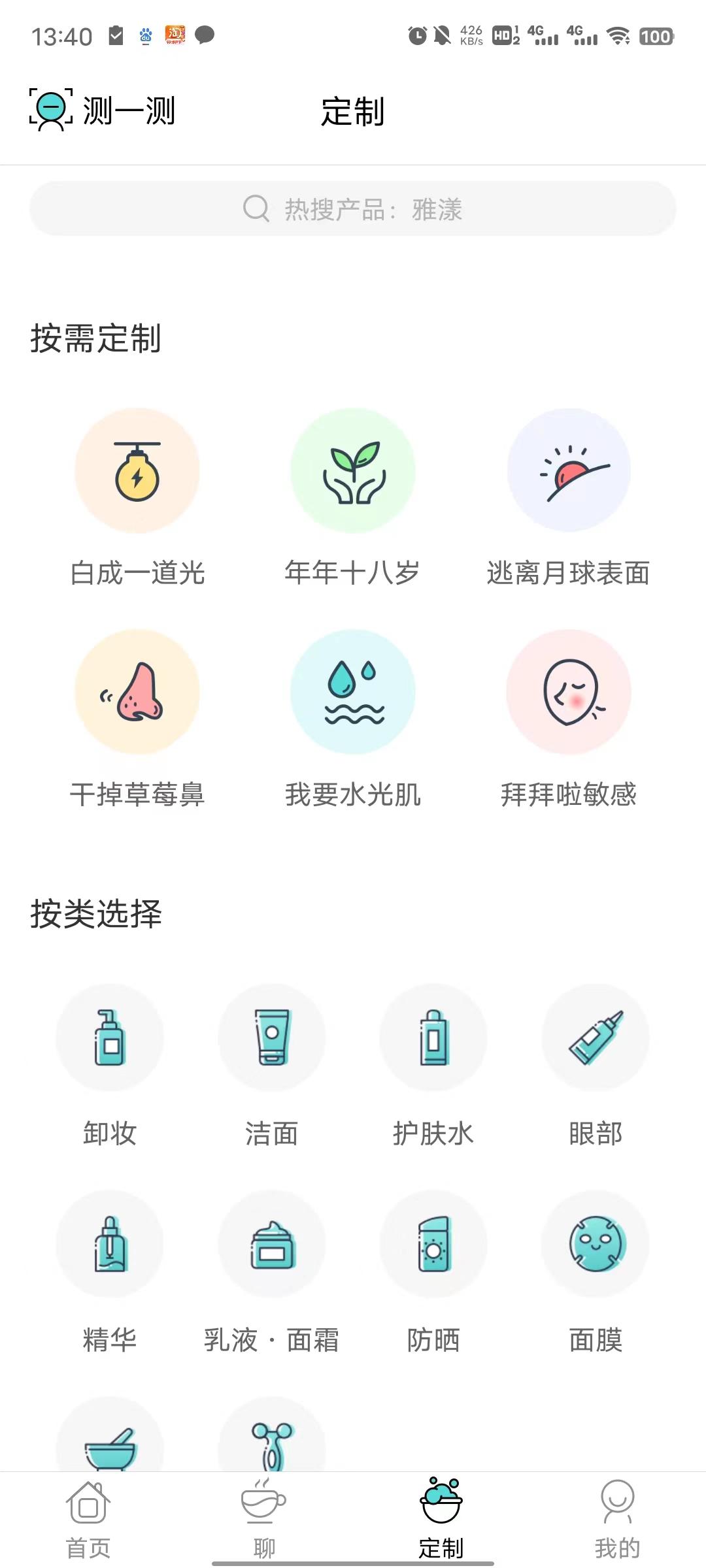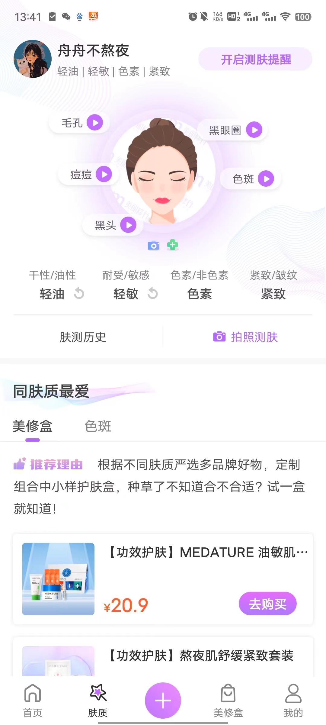 用户拍照测肤质,系统通过数据分析生成用户专属肤质报告&指南,指导用户正确护肤,并提供对应的适用产品,同时提供肤质问题的解决视频,用户可以选择观看。同时系统会自动筛选同肤质其他用户的使用产品并进行推荐。给用户提供一个选择参照。
