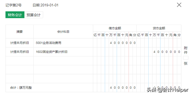 2019年1月1日,根据“固定资产折旧计算表”,本月应计提固定资产折旧共计40 000.00元。