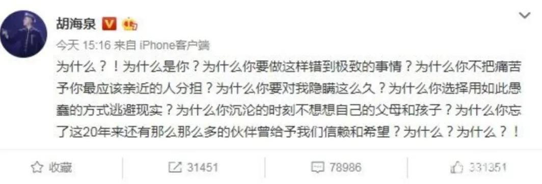 陈羽凡吸毒被抓曝光之后,迅速成为各大社交媒体的头条,作为二十年的好搭档胡海泉更是发文“十问”陈羽凡。