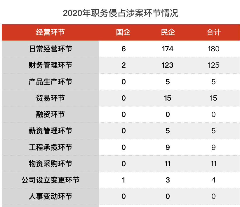 该份报告还表明了,民营企业涉及职务侵占的频次远超于国有企业。对比所有的罪名的涉案环节而言,职务侵占发生在企业的各种岗位、各个经营环节。管理岗、财务岗、采购岗、销售岗,都有涉及。但“日常经营环节”和“财务管理环节”是职务侵占涉案最高发的两个环节。