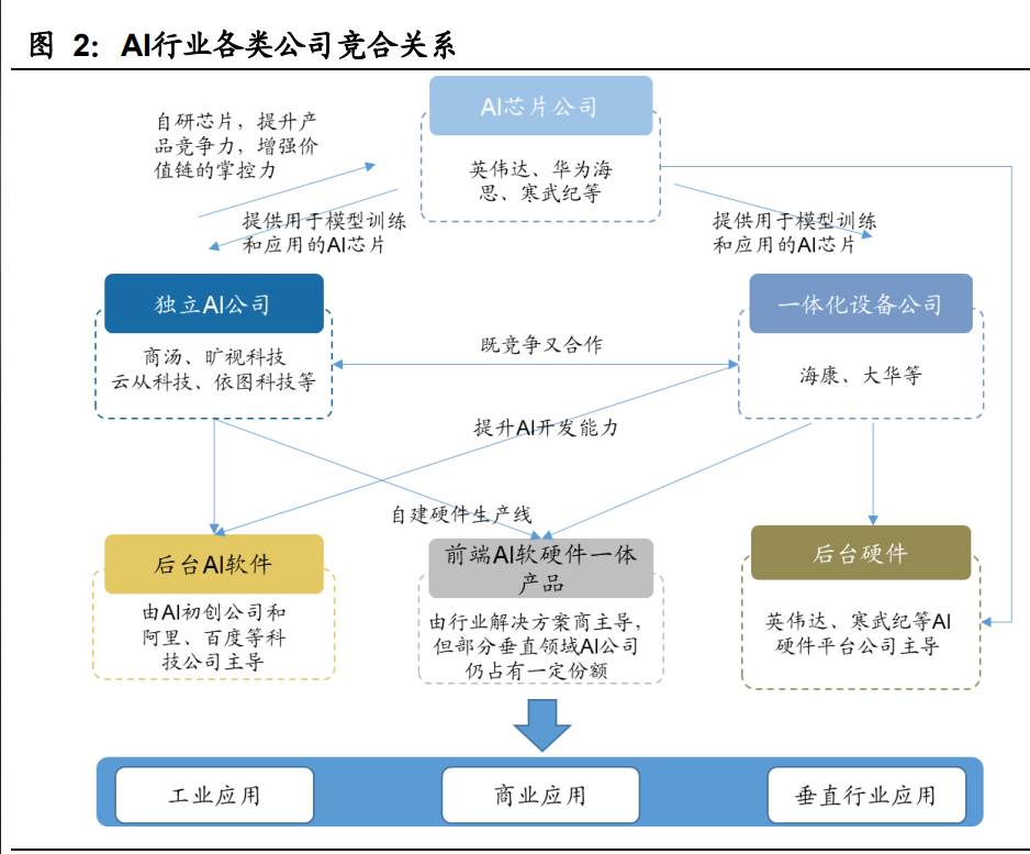 以商汤、科大讯飞为代表的独立AI公司在技术积累、场景下沉、渠道开拓方面已经走 在了行业前列,市场份额较为领先,但其面临大型科技公司、一体化设备公司和新 兴AI公司的追赶。随着百度、阿里为代表的大型科技公司和海康、大华为代表的一体 化设备公司在AI技术的研发持续投入,前端设备的AI算法和独立AI公司的技术差距 快速缩小。一体化设备公司在城市运营管理领域深耕多年,已形成全国性的销售网 络,品牌和渠道优势明显,议价能力较独立AI公司更强。此外,在部分垂直领域,人 脸识别等智能感知技术门槛降低,初创型AI企业纷纷入局,相应市场份额有所提升。 我们认为,未来人工智能行业竞争将会进一步加剧,各家公司在前沿技术的开发进 度、产品的商业化落地、市场开拓以及产业链布局是竞争的关键因素。