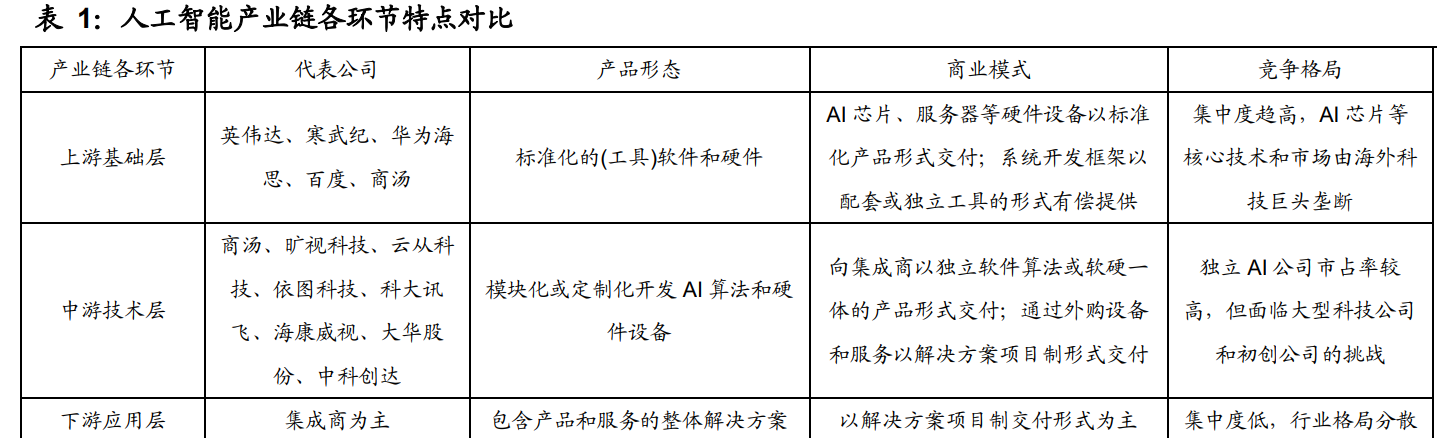 AI产业上游产品标准化程度较高,市场集中度高;中下游定制化开发占比较大,市 场分散。以AI芯片和系统开发框架为主的AI上游的产品提供的算力算法支持具有通 用性特征,容易形成标准化产品;此外,其技术壁垒高,掌握关键技术的英伟达、谷 歌等海外科技公司持续提升产品性能、培育软件开发生态,已有较高市占率。