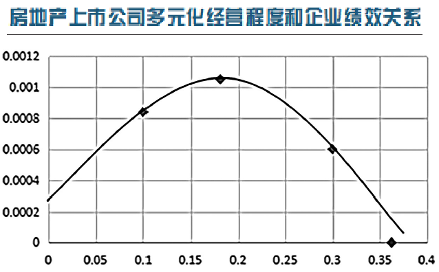 3.多元化对房地产行业上市公司绩效的影响“先升后降”。为了验证企业的多元化经营与企业绩效之间是否存在非线性关系,本文在全样本模型中加入了多元化经营指标的二次项。结果表明,随着房地产上市公司多元化经营程度的提高,在一定水平内可以提高企业的经营绩效,此时企业实施多元化战略,可以共享资源,节省人工、沟通等方面成本。但超过一定水平后就会降低企业的经营绩效(如图)。也就是说,房地产上市公司的多元化经营程度最好控制在一定范围内,这样企业绩效才会提升,当企业过度追求多元化时,就会使企业进入“多元化误区”。