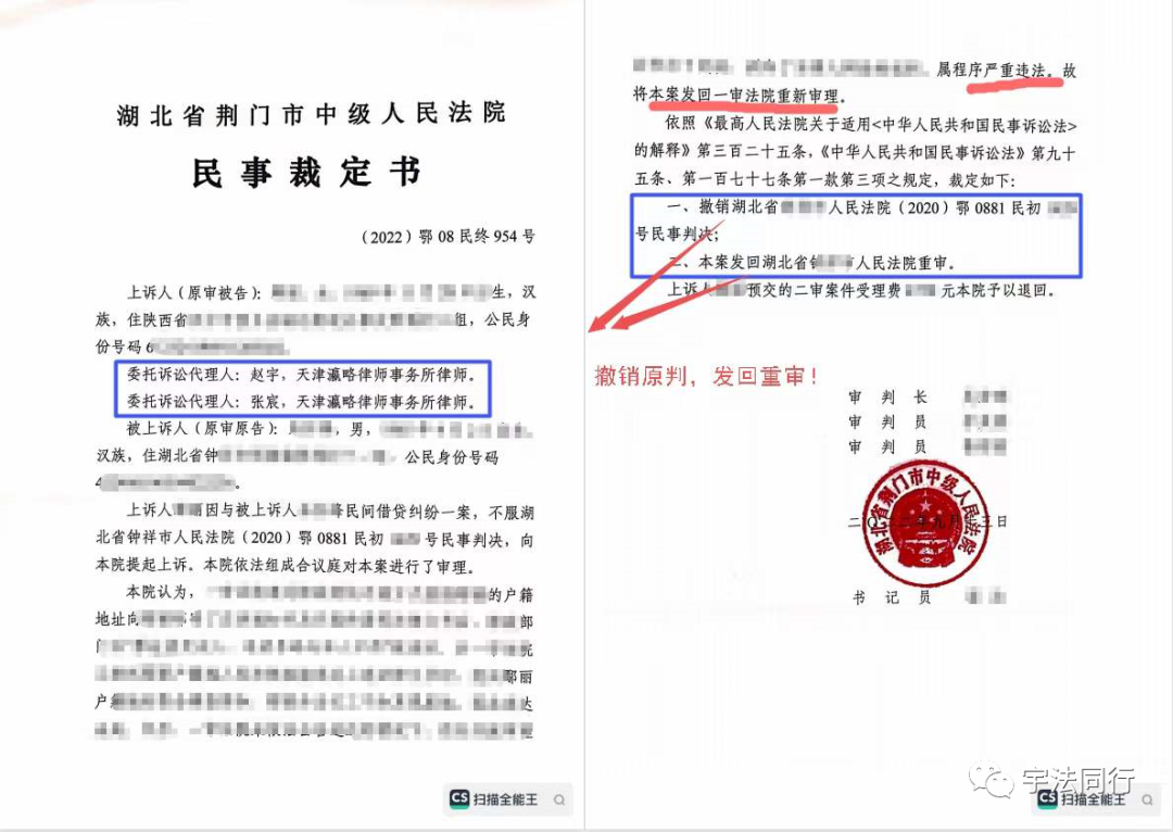 捷报:2022年9月16日,赵宇律师接到湖北省荆门市中级法院的“撤销原判、发回重审”的民事裁定书(图1)!