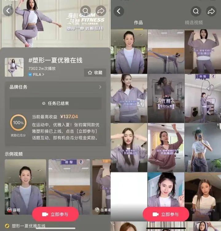 由FILA官方账号发起的#塑性一夏优雅在线 话题,完成品牌任务,吸引用户参与品牌任务,即使用指定贴纸“夏日优雅塑性”,带话题真人出镜拍摄健身瞬间,即可获得现金奖励。视频拍摄简单,更能激发参与用户的运动激情,并且能准确地传递出品牌对于运动的价值导向。