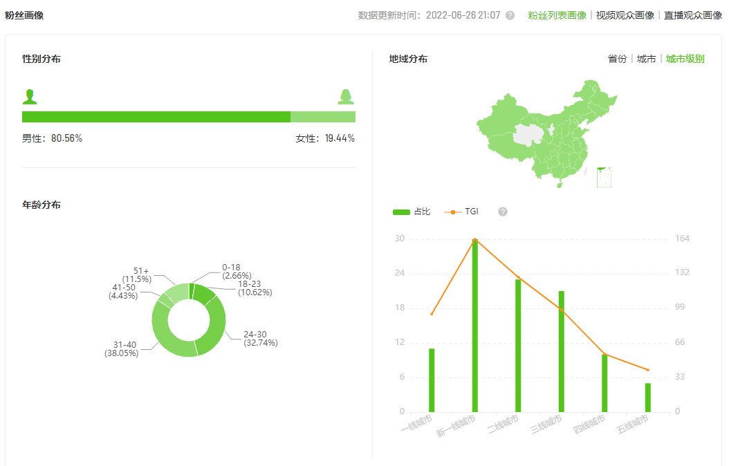 通过粉丝分析可以看到,@小鹏汽车官方旗舰店约8成观众为男性,年龄主要分布在24-40岁区间,新一线城市、二线城市、三线城市用户占比较高,同时一线城市人气的偏好都较高。