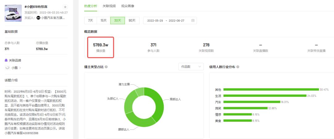 2022年以来,油价一路上涨,四轮市场逐渐偏向新能源汽车,小鹏汽车作为国内新能源汽车领军品牌之一,近期更是抓住市场风向,挥出“大手笔”打出一场漂亮的营销战役,话题播放量高达5789.3w。