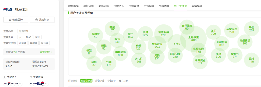 从用户关注点可见斐乐整体商品评价偏正向“上身效果”、“质量”、“外形”等是买家的主要评价,带货口碑极佳。