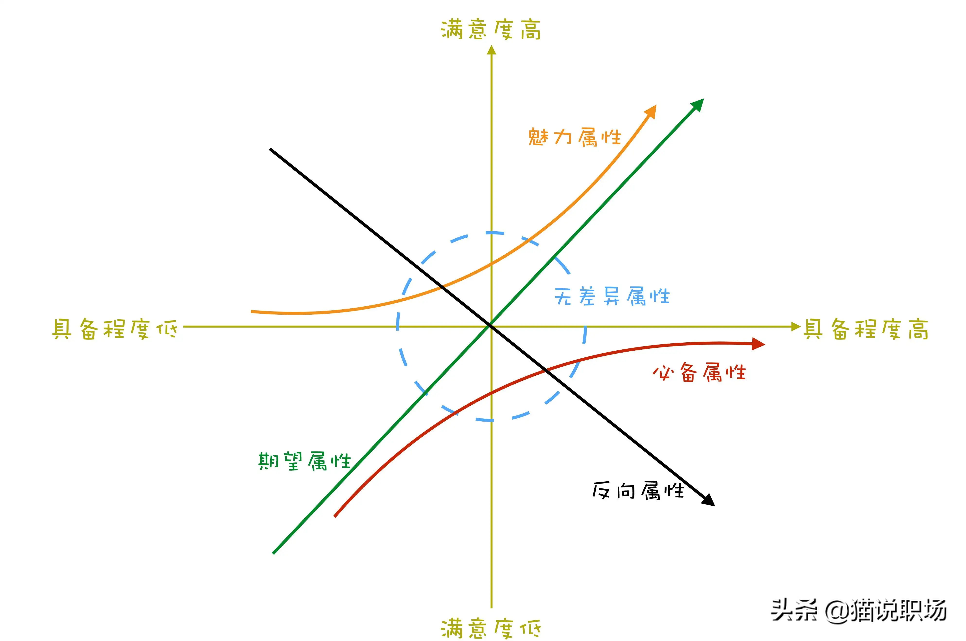 这个模型常用于分析产品需求,是东京理工大学狩野纪昭教授发明的。KANO用于定性指标,以分析用户需求对用户满意度的影响为基础,它反映了产品各个属性和用户满意度之间的非线性关系。