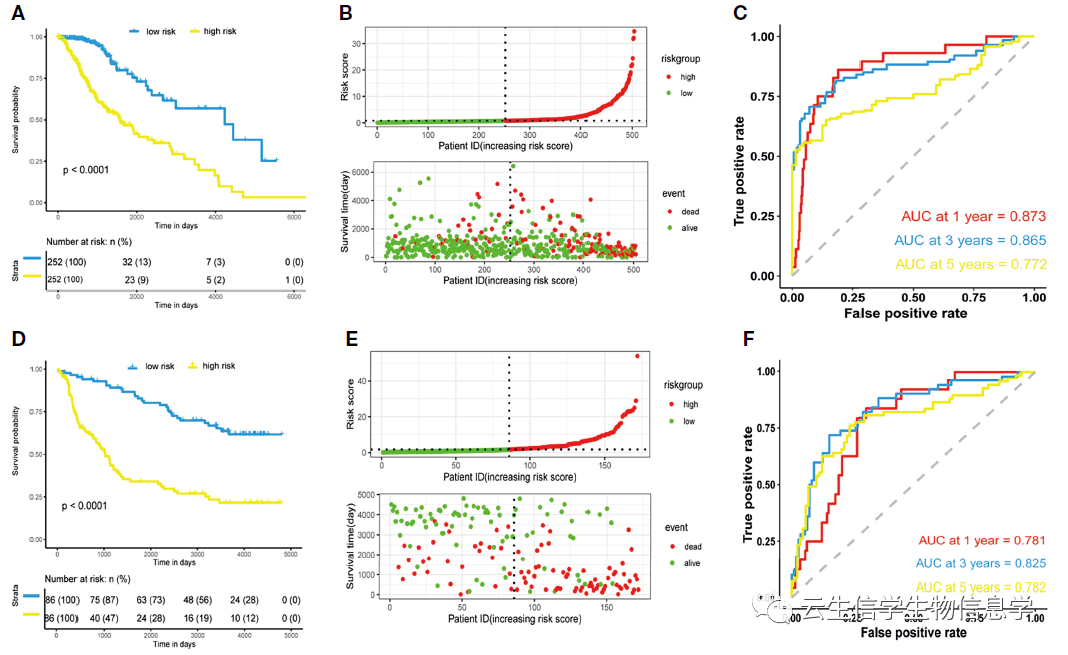 根据m5C LPS计算患者的风险评分,将患者分为高、低风险组,Kaplan-Meier曲线进行生存分析 (图2A),并绘制风险评分和生存状态分布(图2B)。ROC曲线评估m5C LPS预测预后的能力(图2C)。在CGGA325数据集得到相似的结果(图2D-F)。