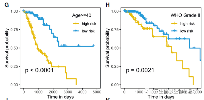 分析m5C LPS与临床病理特征(MGMT甲基化、IDH状态和WHO分级等)的相关性 (图3A)。Kaplan-Meier曲线分析各lncRNAs表达与患者生存期的相关性(图3B)。另外,m5C LPS中lncRNAs在WHO分级、年龄和MGMT甲基化等亚组中均有显著差异(图3D-E)。作者还分析了m5C LPS风险评分对不同临床病理亚组预后的影响 (图3G-H)。
