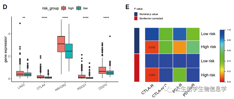 利用CIBERSORTx研究m5C相关lncRNAs与免疫浸润的相关性(图6A)。LAG3、CTLA4等免疫检查点蛋白在高风险组的表达也明显高于低风险组(图6D)。进一步发现高风险组患者对免疫治疗的反应更强(图6E)。